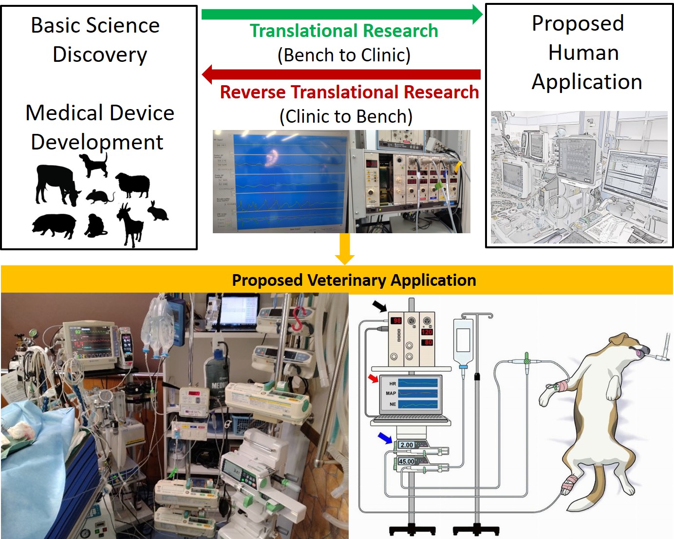 弊所では世界各国の科学者や臨床家と実施する(した)学際領域における周術期医学や急性期医療に関するトランスレーショナル研究の成果やリバーストランスレーショナル研究における着眼点を、伴侶動物の治療にも活用する活動に独自の財源から取り組んでいます。当該領域におけるこのような研究と臨床の両者の活動に取り組む個人の動物診療施設は、世界的にも稀有な存在です。一般に、学際領域におけるトランスレーショナル研究の概念には、伴侶動物への科学研究成果の応用は含まれません。本概念は弊所の獣医学研究者による独自の提案であり、既成の概念に基づくものではありません。